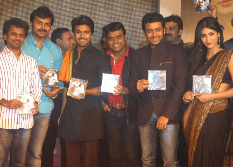 The audio launch of 7th Sense starring Suriya and Shruti Hassan saw the cream of Telugu cinema come to support Suriya, Murugadoss, and Shruti for the movie. The launch saw personalities like Rajamouli, Ram Charan, Allu Arvind, Allu Arjun, and Nikitha wish them luck for the movie. Apart from this, Karthi was also seen accompanying Suriya in high spirits. Suriya was seen being very friendly with Ram Charan Tej and Allu Arjun, showing the close bonding between the stars.