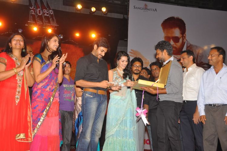 Pawan Kalyan's Panjaa movie audio tracks were launched at a grand function held at Gachibowli stadium on Saturday.