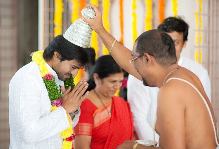 Charan, Upasana families offer prayers at a temple in Apollo Hospital premises on Wednesday, a day before their engagement.
