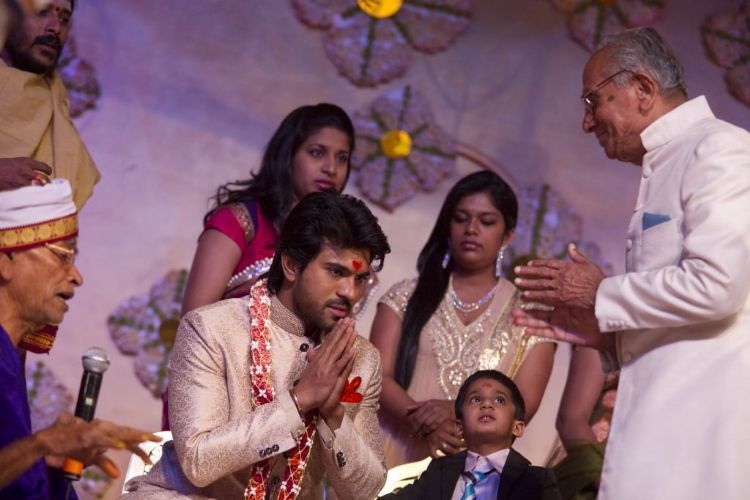Actor Ram Charan Tej and Upasna Kamineni exchanging wedding rings during their engagement held at Temple Trees farm house in Hyderabad on Thursday.