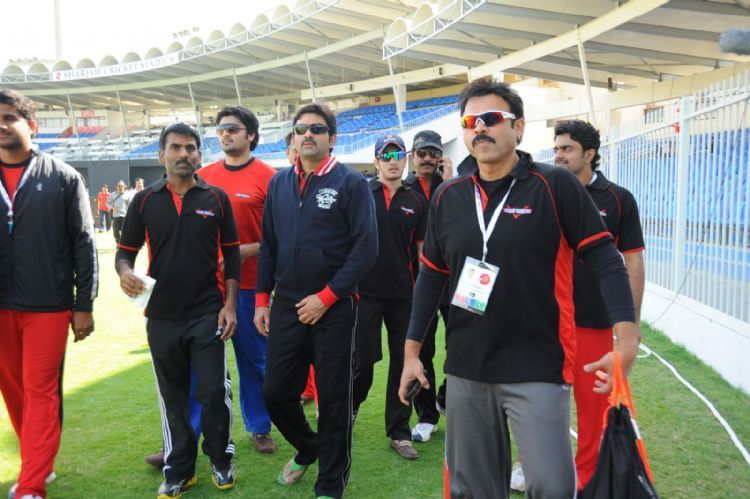 The film indutsry from across India has started descending in Sharjah for the CCL-II which kicks of on 13th January at the Sharjah International Stadium. The first match will be played between Mumbai Heroes and Telugu warriors . The tollywood team which had landed a day in advance was seen practising at the stadium led by megastar Venkatesh.