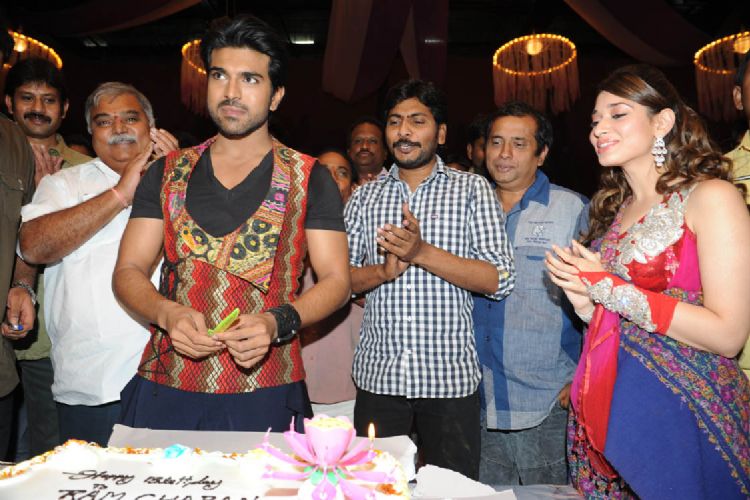 Ram Charan celebrates his birth day among Racha team on Monday.