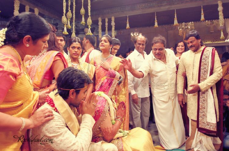 Film celebrities and prominent personalities from political and business field blessed actor Ram Charan Teja, who tied the nuptical knot with childhood sweetheart Upasana Kamineni, at Temple trees, Moinabad on Friday morning.