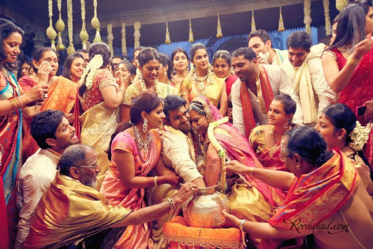 Film celebrities and prominent personalities from political and business field blessed actor Ram Charan Teja, who tied the nuptical knot with childhood sweetheart Upasana Kamineni, at Temple trees, Moinabad on Friday morning.