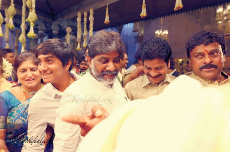 Film celebrities and prominent personalities from political and business field blessed actor Ram Charan Teja, who tied the nuptical knot with childhood sweetheart Upasana Kamineni, at Temple trees, Moinabad on Friday morning.
