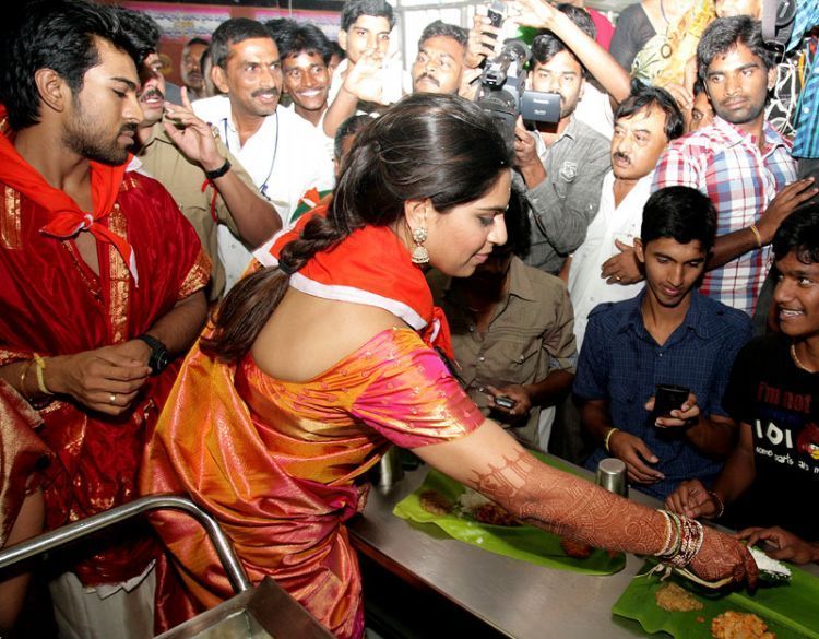 The newly wed celebrity couple, actor Ramcharan Tej and his wife Upasana took part in the Srivari Seva voluntary service at Matrusri Tarigonda Vengamamba Nityannaprasada Bhavan at Tirumala on Saturday.