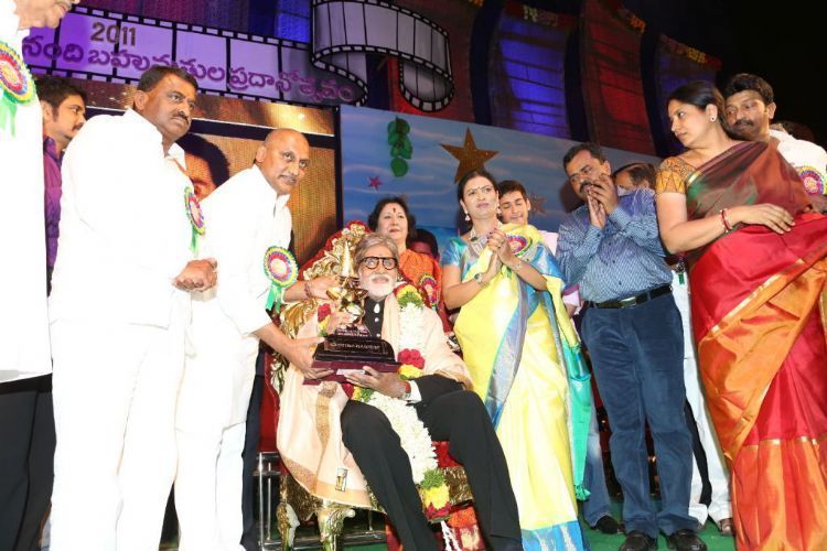 ‘Big B’ Amitabh Bachchan receives NTR National Film Award, Nayantara, Mahesh and Nagarjuna get Nandi awards. The applause that began when his name was announced, rose to a crescendo as the Big ‘B’ got up to receive the NTR National Film Award for 2011 from the hands of Chief Minister N. Kiran Kumar Reddy at a glittering function here on a hot Thursday evening