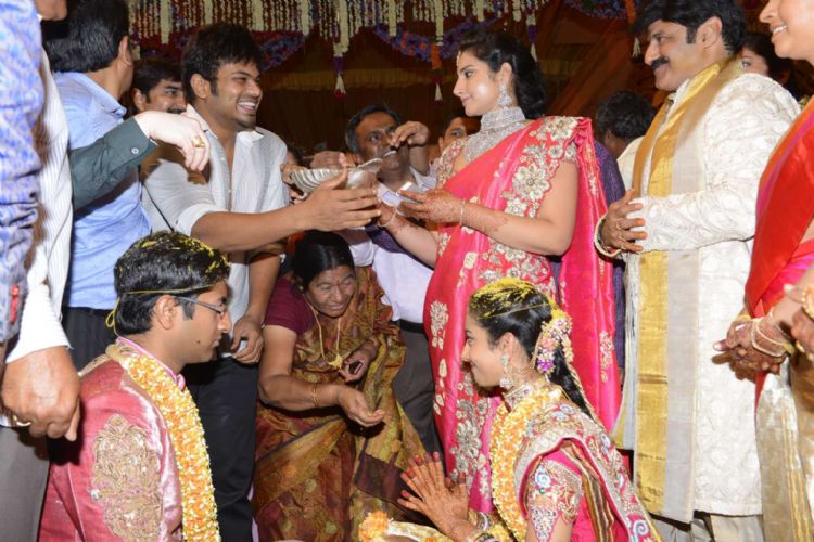 Actor Nandamuri Balakrishna�s younger daughter Tejaswini ties the knot with Sri Bharat at a grand ceremony held in HiTex Convention Center in Hyderabad on Wednesday. Several top political leaders and celebrities of Telugu and Tamil film industry attended the event and blessed the newlywed couple.