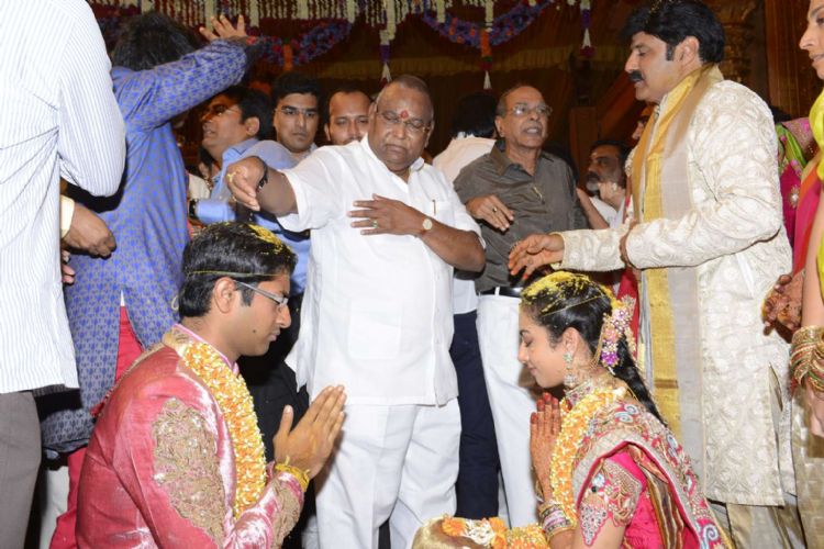 Actor Nandamuri Balakrishna�s younger daughter Tejaswini ties the knot with Sri Bharat at a grand ceremony held in HiTex Convention Center in Hyderabad on Wednesday. Several top political leaders and celebrities of Telugu and Tamil film industry attended the event and blessed the newlywed couple.