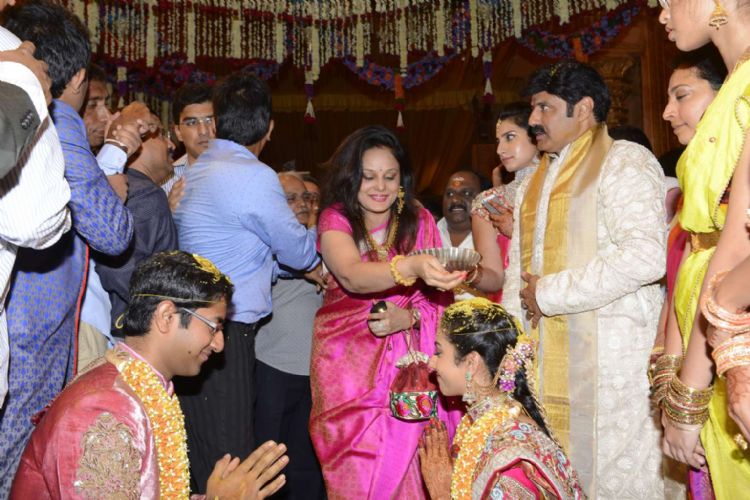Actor Nandamuri Balakrishna�s younger daughter Tejaswini ties the knot with Sri Bharat at a grand ceremony held in HiTex Convention Center in Hyderabad on Wednesday. Several top political leaders and celebrities of Telugu and Tamil film industry attended the event and blessed the newlywed couple.