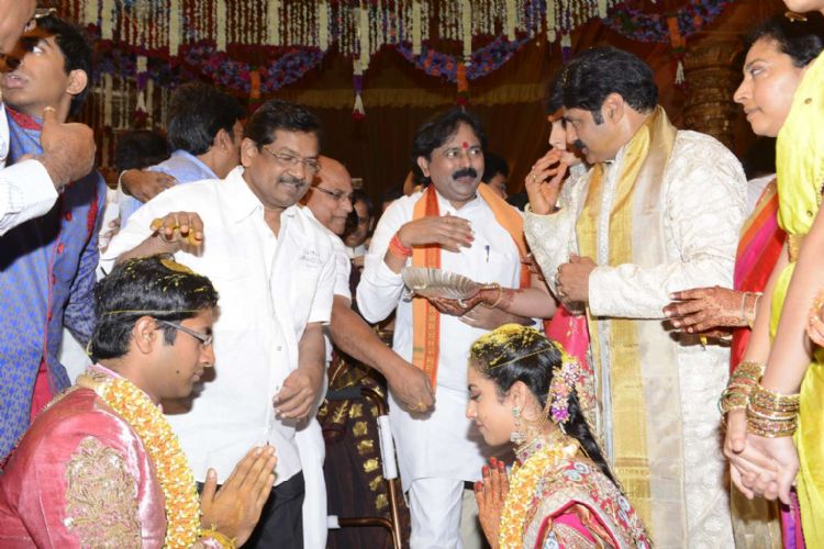 Actor Nandamuri Balakrishna�s younger daughter Tejaswini ties the knot with Sri Bharat at a grand ceremony held in HiTex Convention Center in Hyderabad on Wednesday. Several top political leaders and celebrities of Telugu and Tamil film industry attended the event and blessed the newlywed couple.