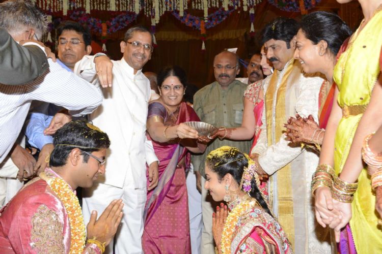 Actor Nandamuri Balakrishna�s younger daughter Tejaswini ties the knot with Sri Bharat at a grand ceremony held in HiTex Convention Center in Hyderabad on Wednesday. Several top political leaders and celebrities of Telugu and Tamil film industry attended the event and blessed the newlywed couple.