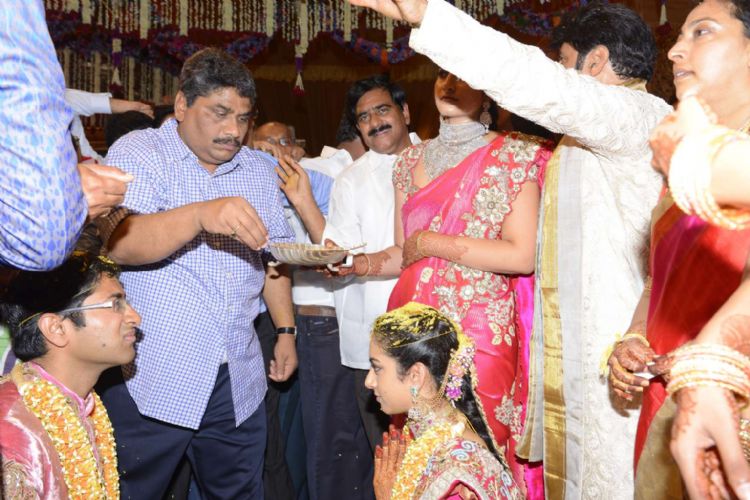 Actor Nandamuri Balakrishna�s younger daughter Tejaswini ties the knot with Sri Bharat at a grand ceremony held in HiTex Convention Center in Hyderabad on Wednesday. Several top political leaders and celebrities of Telugu and Tamil film industry attended the event and blessed the newlywed couple.