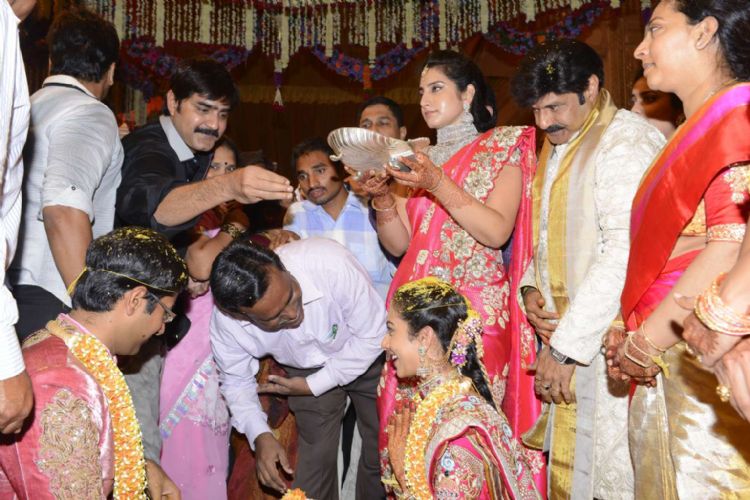 Actor Nandamuri Balakrishna�s younger daughter Tejaswini ties the knot with Sri Bharat at a grand ceremony held in HiTex Convention Center in Hyderabad on Wednesday. Several top political leaders and celebrities of Telugu and Tamil film industry attended the event and blessed the newlywed couple.