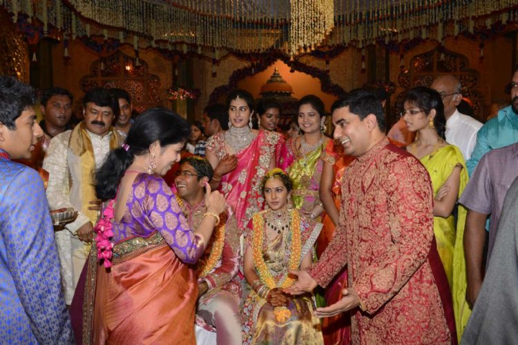 Actor Nandamuri Balakrishna�s younger daughter Tejaswini ties the knot with Sri Bharat at a grand ceremony held in HiTex Convention Center in Hyderabad on Wednesday. Several top political leaders and celebrities of Telugu and Tamil film industry attended the event and blessed the newlywed couple.