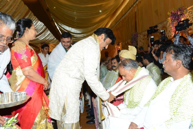Actor Nandamuri Balakrishna�s younger daughter Tejaswini ties the knot with Sri Bharat at a grand ceremony held in HiTex Convention Center in Hyderabad on Wednesday. Several top political leaders and celebrities of Telugu and Tamil film industry attended the event and blessed the newlywed couple.