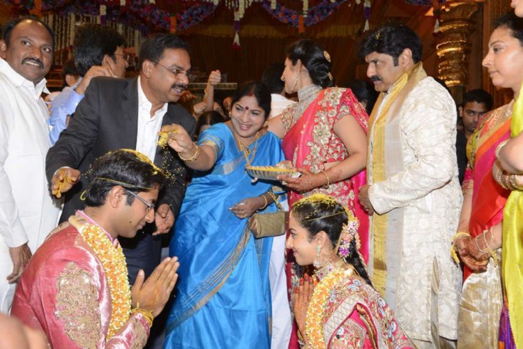 Actor Nandamuri Balakrishna�s younger daughter Tejaswini ties the knot with Sri Bharat at a grand ceremony held in HiTex Convention Center in Hyderabad on Wednesday. Several top political leaders and celebrities of Telugu and Tamil film industry attended the event and blessed the newlywed couple.