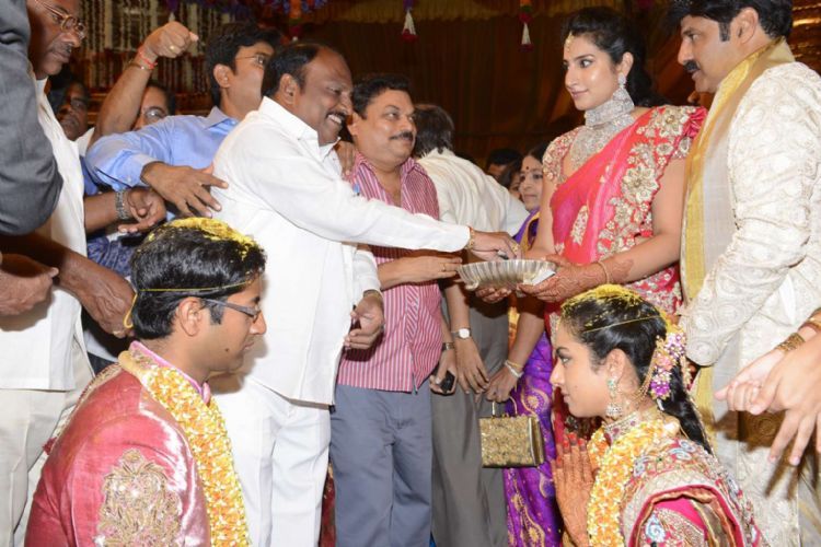 Actor Nandamuri Balakrishna�s younger daughter Tejaswini ties the knot with Sri Bharat at a grand ceremony held in HiTex Convention Center in Hyderabad on Wednesday. Several top political leaders and celebrities of Telugu and Tamil film industry attended the event and blessed the newlywed couple.