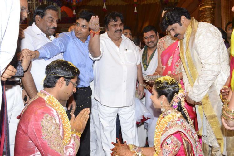 Actor Nandamuri Balakrishna�s younger daughter Tejaswini ties the knot with Sri Bharat at a grand ceremony held in HiTex Convention Center in Hyderabad on Wednesday. Several top political leaders and celebrities of Telugu and Tamil film industry attended the event and blessed the newlywed couple.