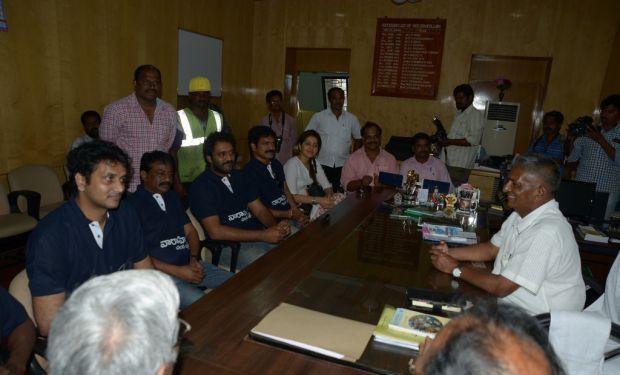 Producer Sai Korrapati after announcing 100 tonnes of rice for Hudhud cyclone victims, visited Vizag along with Srinivas Avasarala, Ajay, Rashi Khanna, Trikoti and other Vaarahi team members.Sai distributed the rice and donated cheques to various social organizations and CM relief fund. Big Heart right!