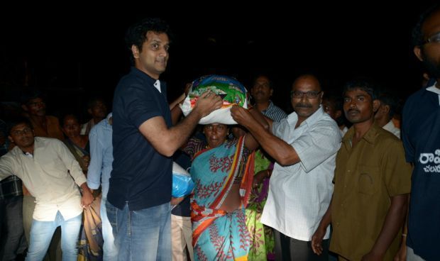 Producer Sai Korrapati after announcing 100 tonnes of rice for Hudhud cyclone victims, visited Vizag along with Srinivas Avasarala, Ajay, Rashi Khanna, Trikoti and other Vaarahi team members.Sai distributed the rice and donated cheques to various social organizations and CM relief fund. Big Heart right!