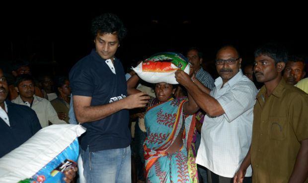 Producer Sai Korrapati after announcing 100 tonnes of rice for Hudhud cyclone victims, visited Vizag along with Srinivas Avasarala, Ajay, Rashi Khanna, Trikoti and other Vaarahi team members.Sai distributed the rice and donated cheques to various social organizations and CM relief fund. Big Heart right!
