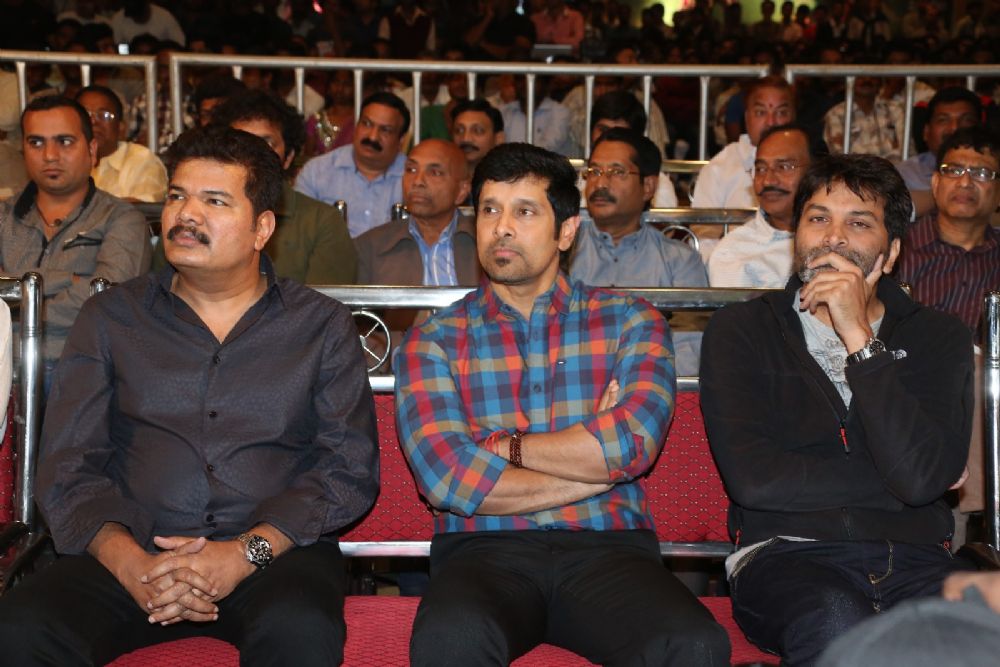 Telugu audio of Shankar's 'i' released at a grand event in Park hotel, Hyderabad, Director SS Rajamouli launched the audio and gave the first CD to director Trivikram Srinivas. The film will release on Sankranthi.