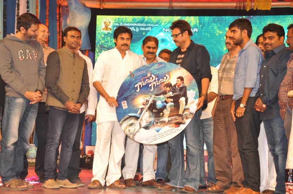 Pawan Kalyan and Venkatesh's "Gopala Gopala" audio released at a grand event in Shilpa Kala Vedika. Director Trivikram Srinivas attended as chief guest. Makers are planning to release the movie on 9th January.