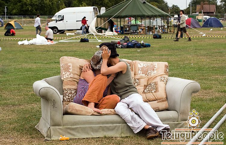 A couple kiss as they set up at the Climate Camp on Blackheath, in south London, on August 26, 2009. Around 1,000 activists descended Wednesday on a stretch of open land in London after the location of the week-long Climate Camp was finally revealed. Protesters arrived from several areas of the capital to Blackheath in south east London, setting up the camp on a hill overlooking Docklands and Canary Wharf.