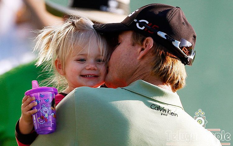 Heath Slocum kisses his 20 month-old daughter Stella, as he celebrates his win at The Barclays golf tournament at Liberty National Golf Club Sunday, Aug. 30, 2009, in Jersey City, N.J.
