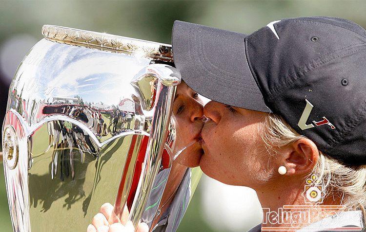 Suzann Pettersen of Norway kisses the LPGA Canadian Women's Open golf tournament trophy on the 18th green at the Priddis Greens Golf course in Priddis near Calgary, Alberta September 6, 2009.