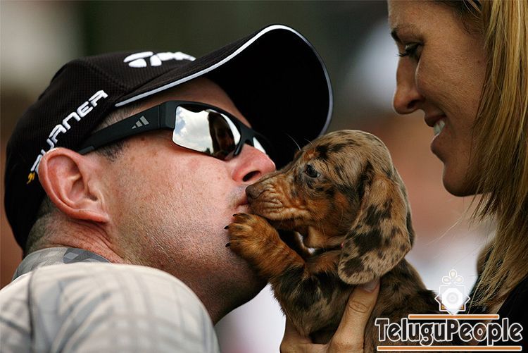 Golfer Rory Sabbatini gives a kiss to his new puppy, Jesse, as his wife Amy watches on the 18th hole after he finished the Chick Evans Memorial Pro-Am at the BMW Championship golf tournament in Lemont, Illinois, Wednesday, Sept. 9, 2009.(