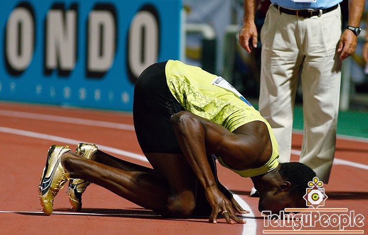 Usain Bolt of Jamaica kisses the ground after winning the Mens 200 meters during day two of the IAAF World Athletics Final at the Kaftanzoglio stadium on September 13, 2009 in Thessaloniki, Greece.