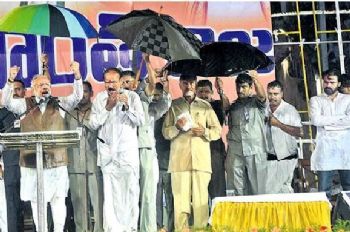 Pawan not only impressed people with his fiery speeches but also with his simplicity. On Thursday after a whirlwind election rallies the trio - Modi, Naidu and Pawan attended a joint meeting at Visakhapatnam. The heavy overcast skies suddenly opened up and started pouring cats and dogs while Modi has been gunning his rivals.