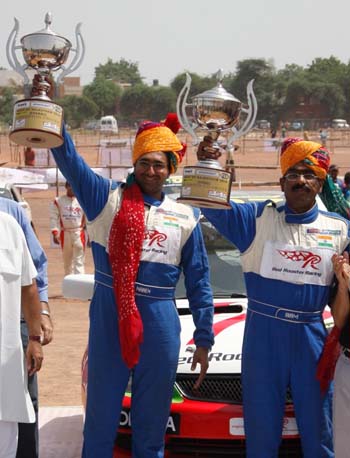 Jodhpur, 19 Sept 2010: Come-back king Naren Kumar, with veteran navigator Ram Kumar in tow, was in his elements as he thrilled the Sunday crowd with controlled aggression in the Super Special Stage but still kept his cool to finish the rally for a second successive victory in the Rally of Rajasthan, the third round of the Speed Indian National Rally Championship 2010 for cars to firmly entrench Team Red Rooster Racing on top of the leaderboard for manufacturers as the first rally in Rajasthan ended here with a sizeable crowd enjoying the daring feats of the drivers.