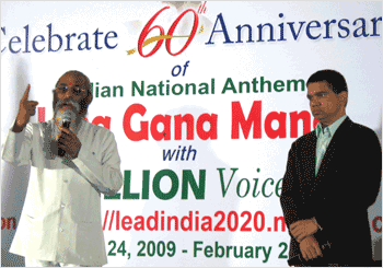 హైదరాబాద్ : జాతీయ గీతంగా 'జన గణ మన' గుర్తింపు పొంది 60 సంవత్సరాలు పూర్తవుతున్న సందర్భంగా దాని విశిష్టతను చాటేందుకు మ్యూజిగల్ డాట్ కాం, సామాజిక సేవా సంస్థ లీడ్ ఇండియా 2020తో ఓ కార్యక్రమం చేపట్టాయి. డిసెంబర్ 24 నుంచి ఫిబ్రవరి 24 వరకూ 60 రోజుల్లో పది లక్షల మందితో 'జన గణ మన' గేయాన్ని ఆలపింపచేయించే కార్యక్రమానికి శ్రీకారం చుట్టింది. ఈ కార్యక్రమంలో పాల్గొని జాతీయ గీతం 'జన గణ మన'ను పాటి రికార్డ్ చేయాలని మ్యూజిగల్ సంస్థ సిఇఓ ఆనంద్ కూచిభొట్ల విజ్ఞప్తి చేశారు. http://leadindia2020.muzigle.comకు సొంత మెయిల్ ఐడితో లాగిన్ అవ్వాలని లేదా రిజిస్టర్ చేసుకోవడానికి ఏదైనా మెయిల్ ఐడి లేదా ఫేస్ బుక్ ఐడితో రిజిస్టర్ చేసుకుని లాగిన్ కావచ్చని ఆనంద్ తెలిపారు. లాగిన్ అయ్యాక 'Karoake Player'లోని జన గణ మన గీతాన్ని విని, సాధన చేసి, అనంతరం రికార్డు చెయ్యవచ్చని ఆనంద్ కూచిభొట్ల తెలిపారు. అయితే, రికార్డు చేసిన గీతాన్ని విని, సరిగ్గా రికార్డు అయితే సేవ్ చెయ్యవచ్చన్నారు. బంజారాహిల్స్ లోని ప్రసాద్ ప్రివ్యూ థియేటర్ లో గురువారం నిర్వహించిన మీడియా సమావేశంలో ఆయన మాట్లాడారు.