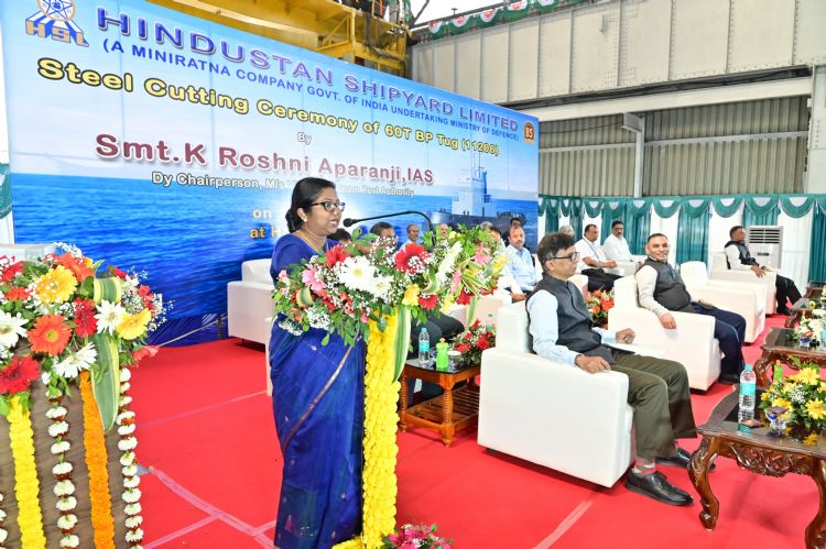 Deputy Chairperson of Visakhapatnam Port Authority (VPA) K. Roshni Aparanji pressed the CNC plasma cutting machine button at the HSL Hull Shop formally commencing fabrication of the tug.