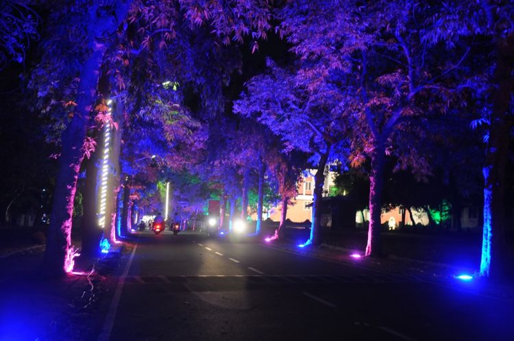 Spread across 425 acres with 200+ buildings, AU's campus is known for its biodiversity. Its emblem tells its philosophy: a rising sun for disciplines, a lotus for knowledge, 64 petals for India's traditional arts and sciences, and the Upanishadic motto _'Tejasvinaavadhitamastu'_ ' 'May our learning be endowed with divine light.'