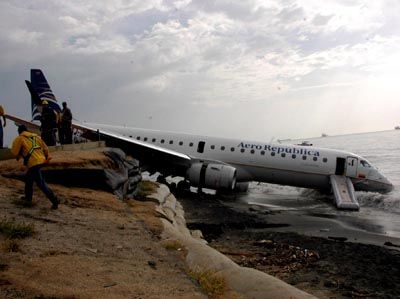 Plane shot off in to sea: An Embraer plane of Colombian Aerorepublica airline carrying 55 passengers went out of the runway after landing and ended up in the ocean, 17 July 2007 , in Santa Marta, Colombia. Six people were injured.