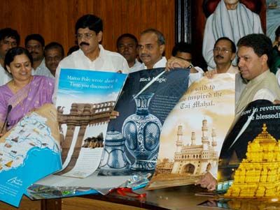 AP Tourism posters released: Chief Minister YS Rajasehkar Reddy releasing AP Tourism publicity material to keep in Air Indias new flight named as "Andhra Pradesh" to United States in Hyderabad on Wednesday.