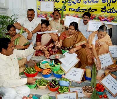 Vegetables shop in Assembly: TDP MLAs selling vegetables in the AP Legislative Assembly protesting against the governments indifferent attitude in controlling vegetables prices on Wednesday.