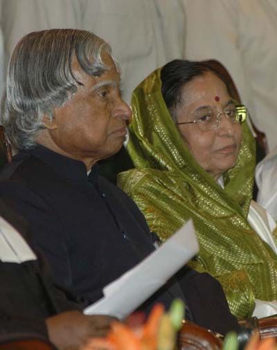 Incoming & Outgoing Presidents: Newly-sworn-in President Pratibha Patil with her predecessor APJ Abdul Kalam at Parliament House in New Delhi on Wednesday.