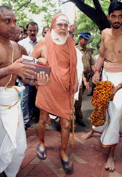 Swamy seeks justice: Kanchi Sankaracharyar Jayendra Saraswati arriving at Madras High Court to attend Auditor Radhakrishnan assault case, in Chennai on Monday.
