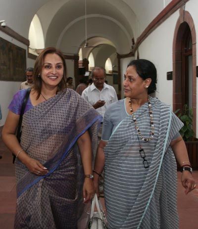 The Jaya Duo: Samajwadi party MPs Jaya Prada and Jaya Bachchan coming out of the Parliament House after witnessing the filing of