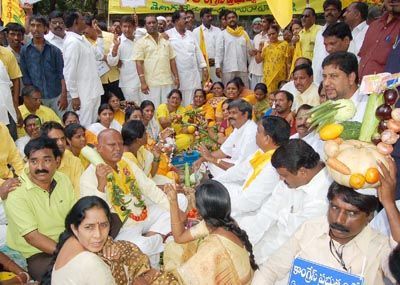 TDP Rythu Bazar: TDP activists staging a dharna at Hyderabad District Collectorate demanding control on spiralling vegetables prices on Thursday.