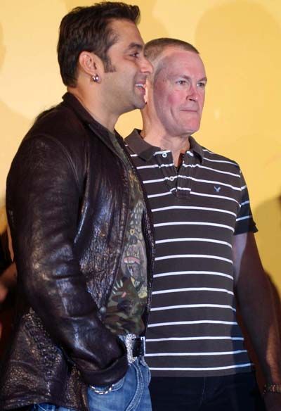 Marigold music launched: Actor Salman Khan with director Willard Carroll at the music release of Adlabs Film "Marigold" in Mumbai on Tuesday night.