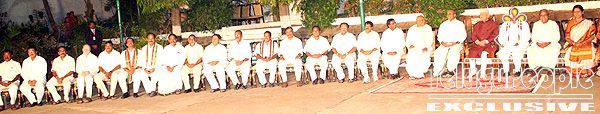 A 35-member Council of Ministers of the newly-elected Congress government was sworn in by Andhra Pradesh Governor N. D. Tiwari in the presence of Chief Minister Y. S. Rajasekhara Reddy and a host of dignitaries on the lawns of Raj Bhavan on Monday evening.