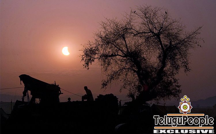 A partial solar eclipse is seen as an internally displaced man loads his belongings onto the back of a truck before departing from the UNHCR (United Nations High Commission for Refugees) Yar Hussain camp in pakistan's Swabi district, about 120 km (75 mi) northwest of Islamabad on July 22, 2009.