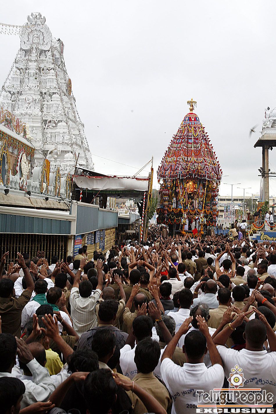 On the penultimate day of Srivari Brahmotsavam , on the eigth day, the Malayalappaswami is seated on a high pedestal throne and taken ina procession around the four mada streets around Tirumala for the benefit of devotees who throng the temple town for a glimpse of Lord Venkateswara in various vahanams and in forms .The Rathotsavam festival is a highly emotional event known for the flow of bhakti sangeet , keertans , bhajans and full pitched rendering by the devotees who accompany the procession of the deity .