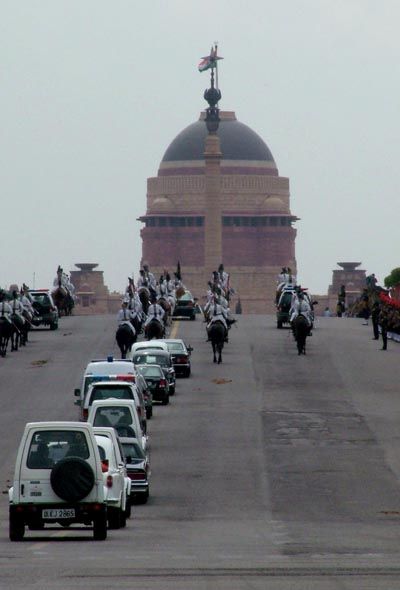 Presidents Convoy: The President s Guards ceremoniously escort President Pratibha Patil to Rashtrapati Bhavan after the swearing-in ceremony in New Delhi on Wednesday.